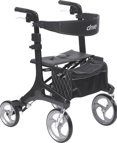 A rollator is a walking aid with three or four wheels, handlebars for steering, and a built-in seat. Unlike standard walkers, rollators don't need to be lifted with each step, making them easier to use for people with limited strength.